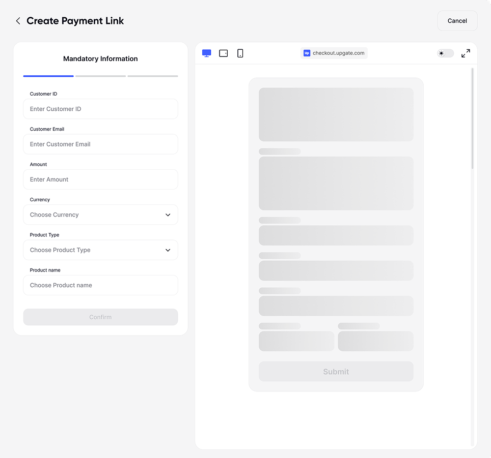 Once merchant click Confirm, the preview fully reveals exactly what the end customer will see (product details, total, and payment methods)