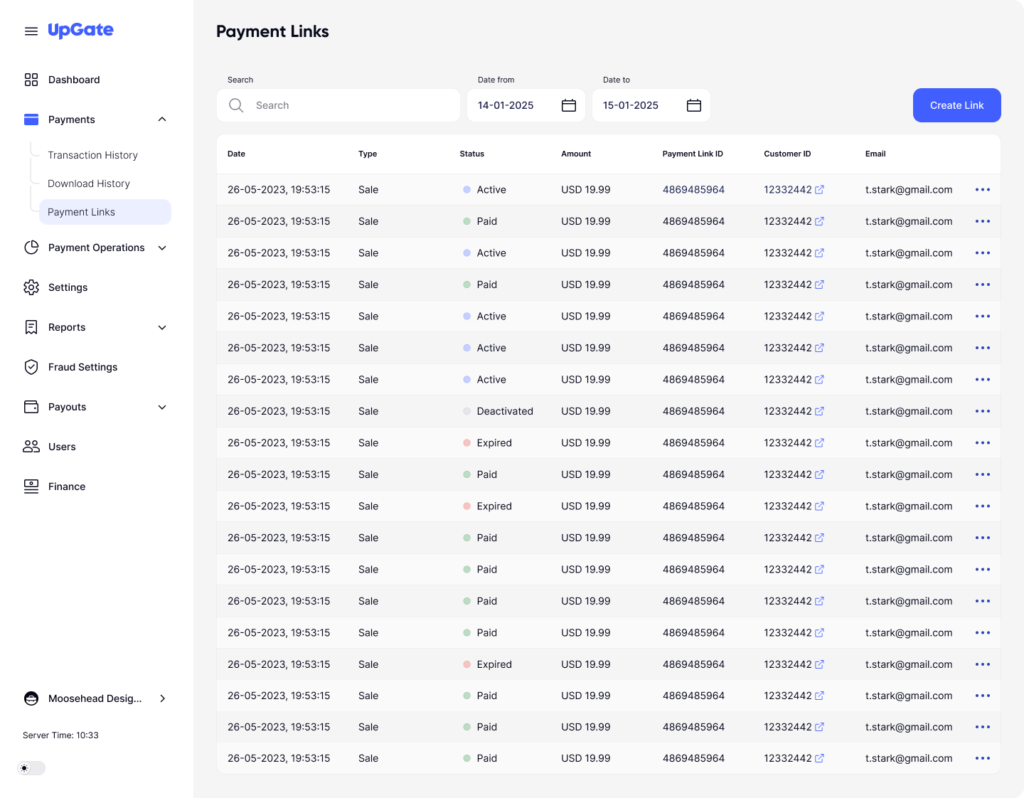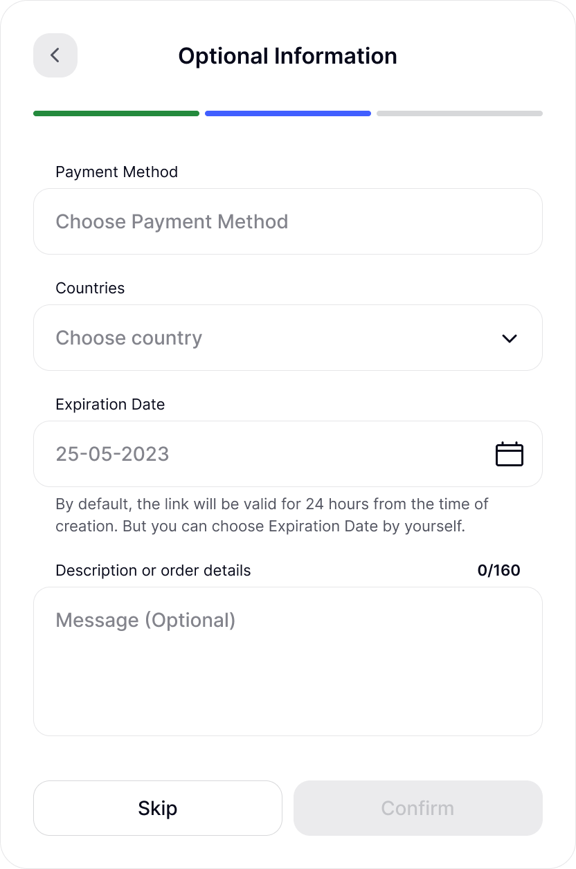 Merchants see real-time status changes and can tie each link to its transaction data. By default, the link expires 24 hours after creation. Merchants may set up to 30 days maximum